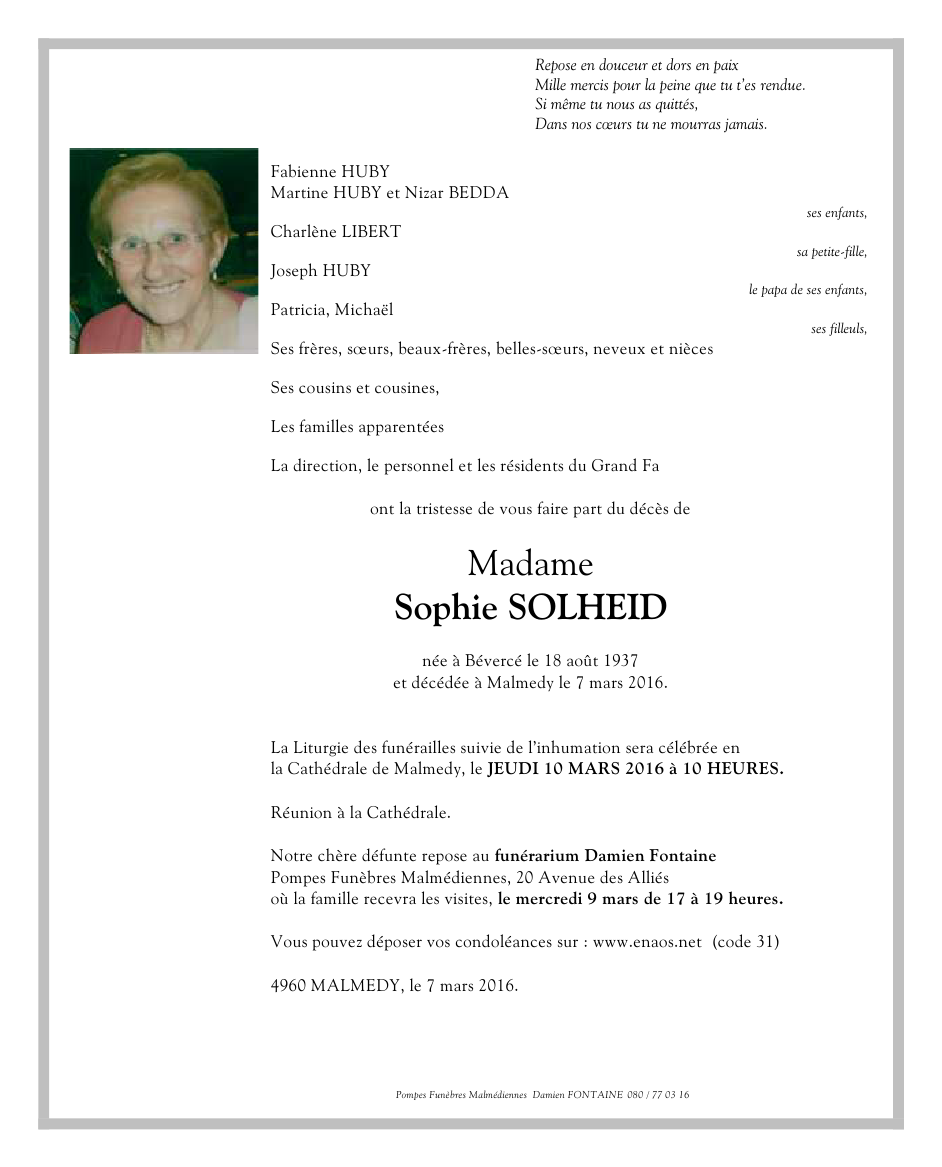 Décédée à Malmedy (4960) le lundi 7 mars 2016 à l'âge de 78 ans