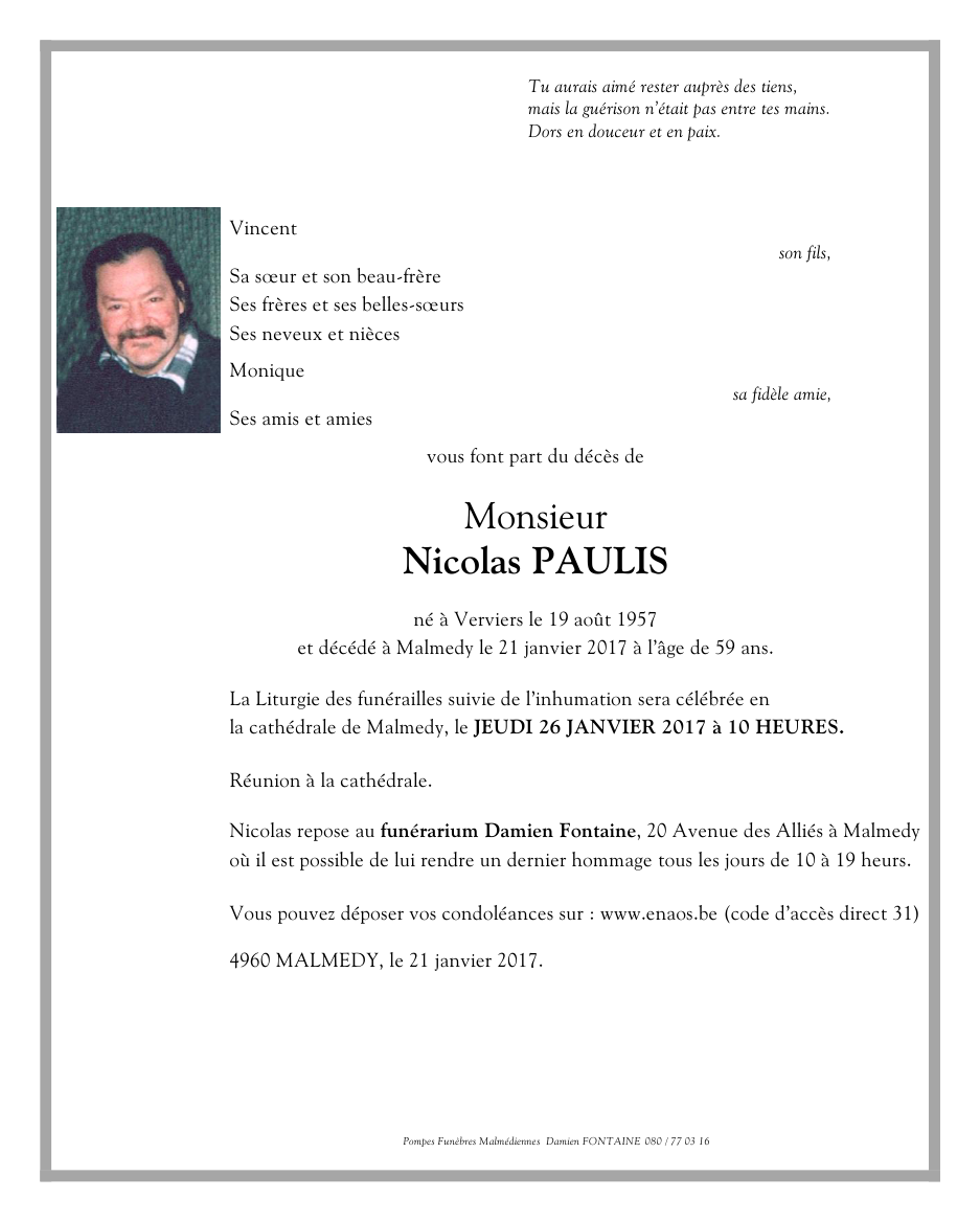 Décédé à Malmedy (4960) le samedi 21 janvier 2017 à l'âge de 59 ans