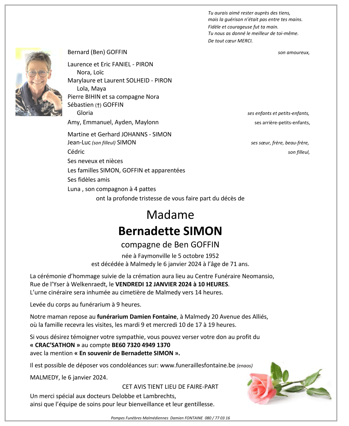 Décédée à Malmedy (4960) le samedi 6 janvier 2024 à l'âge de 71 ans