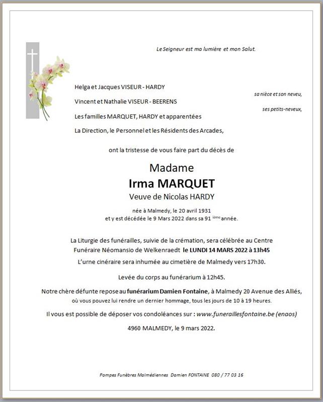 Décédée à Malmedy (4960) le mercredi 9 mars 2022 à l'âge de 90 ans