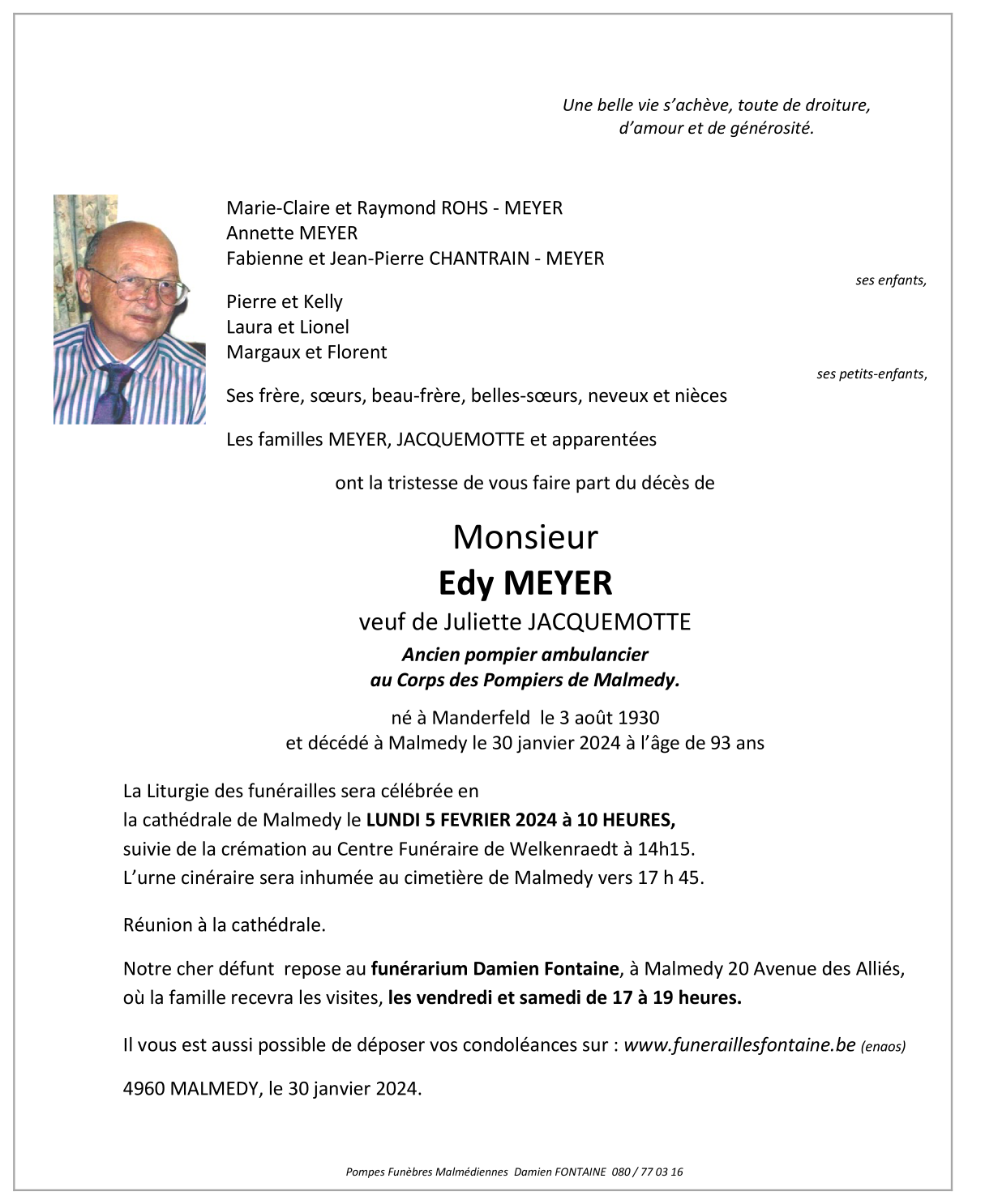 Décédé à Malmedy (4960) le mardi 30 janvier 2024 à l'âge de 93 ans