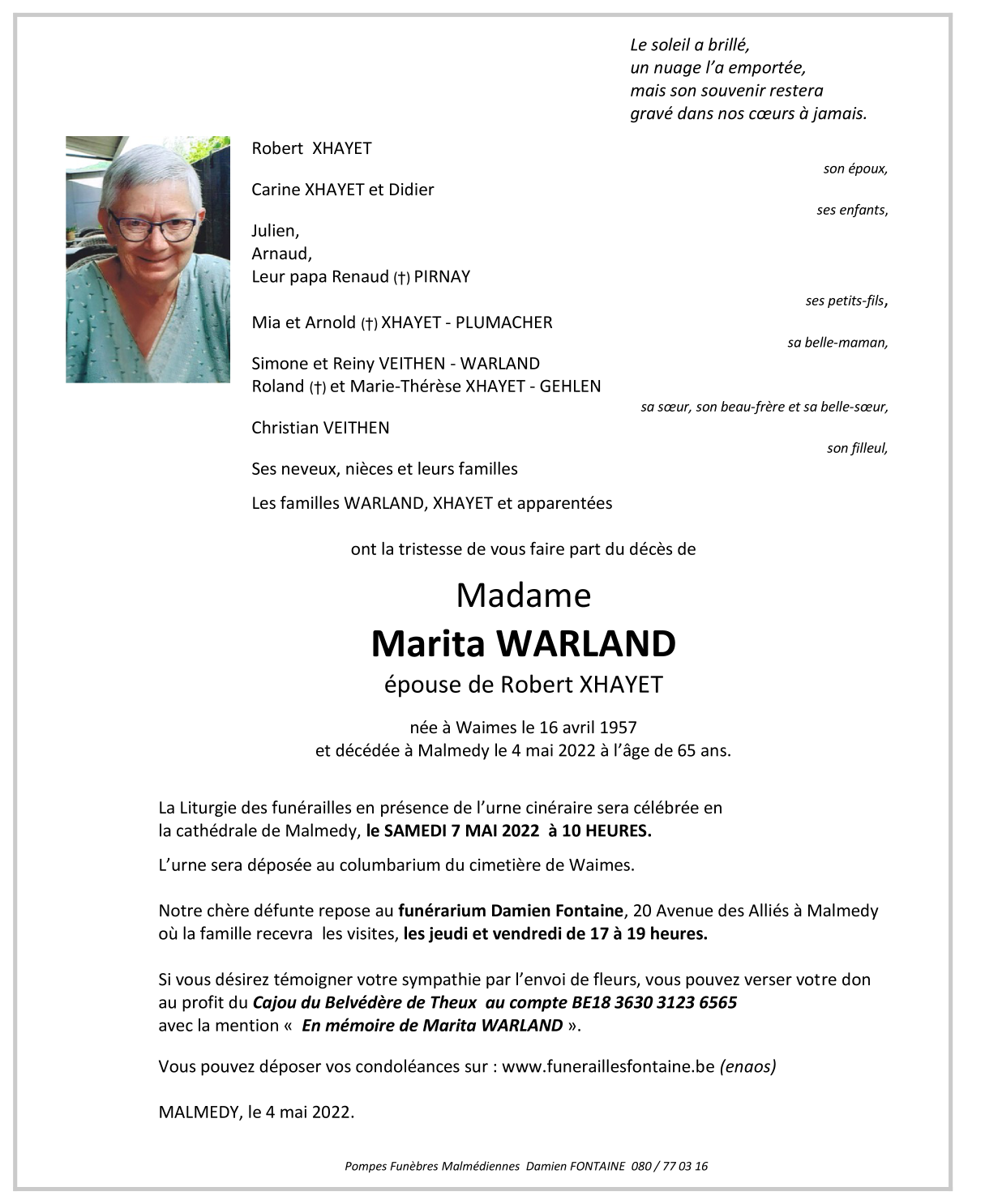 Décédée à Malmedy (4960) le mercredi 4 mai 2022 à l'âge de 65 ans
