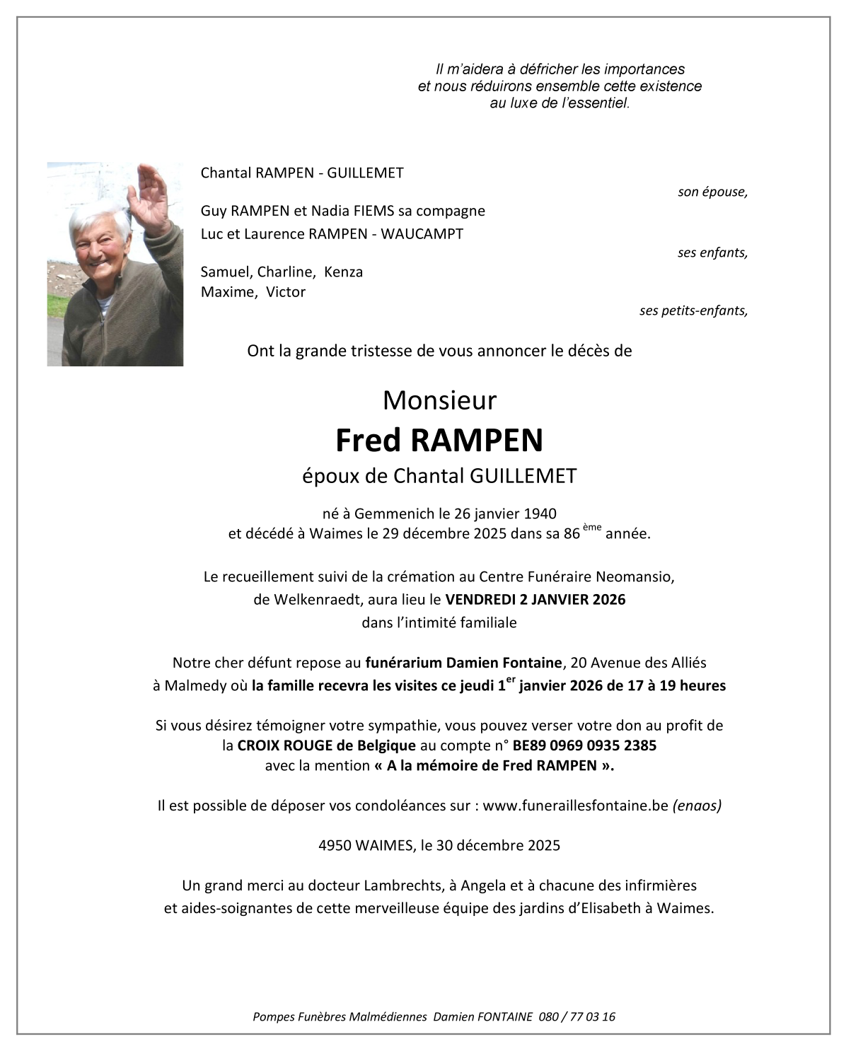 Décédé à Waimes (4950) le lundi 29 décembre 2025 à l'âge de 85 ans