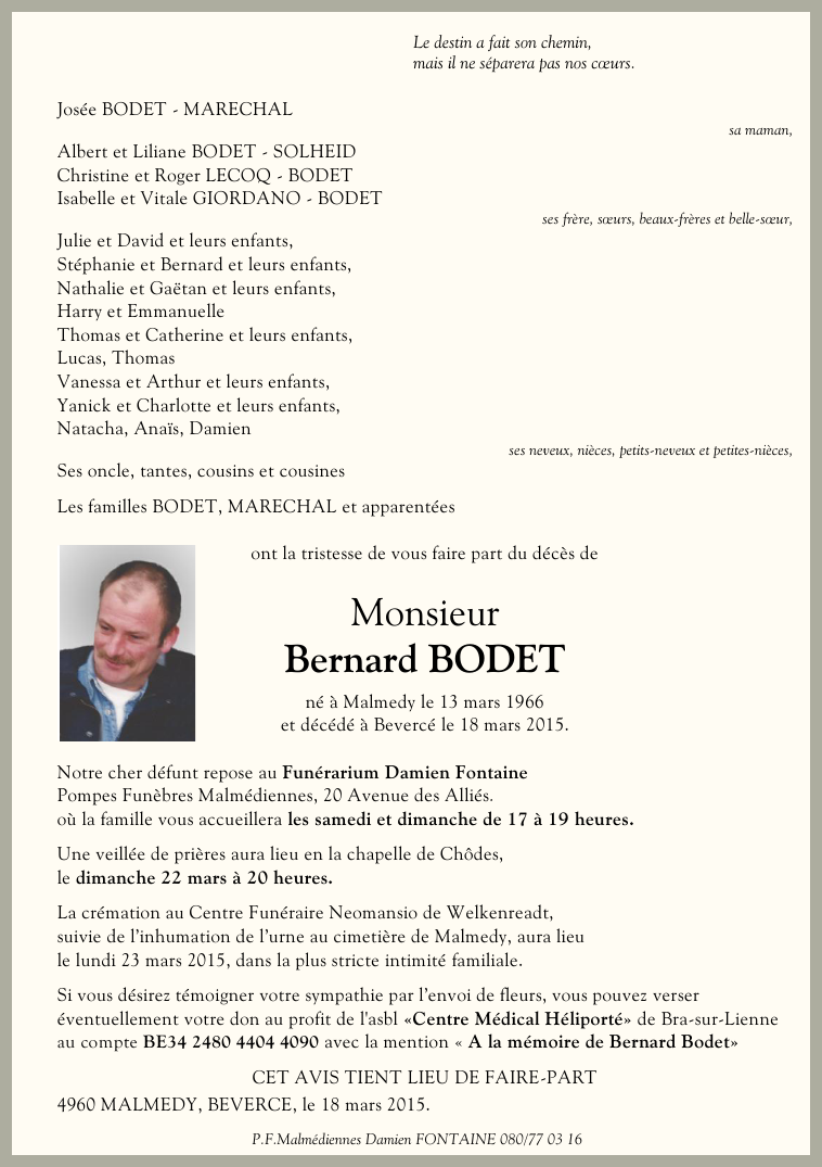 Décédé à Bevercé (4960) le mercredi 18 mars 2015 à l'âge de 49 ans