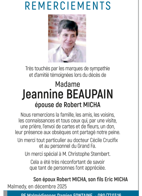 Décédée à Malmedy (4960) le jeudi 25 décembre 2025 à l'âge de 91 ans