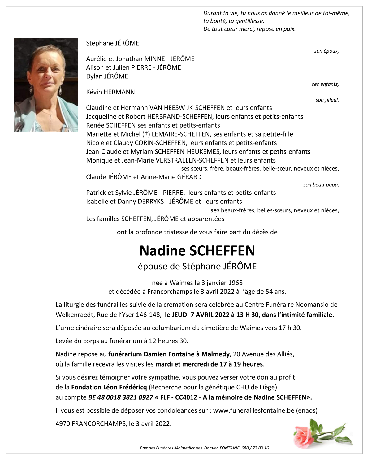 Madame Nadine SCHEFFEN épouse de Stéphane JÉRÔME