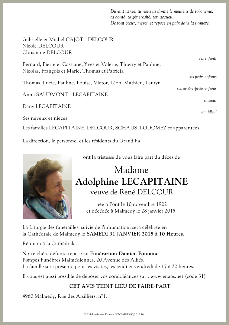 Décédée à Malmedy (4960) le mercredi 28 janvier 2015 à l'âge de 92 ans