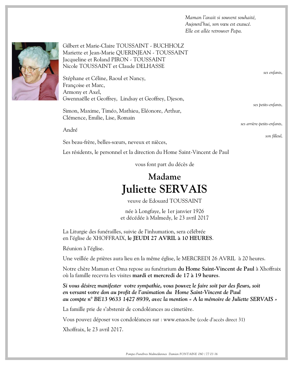 Madame Juliette SERVAIS veuve de Edouard TOUSSAINT