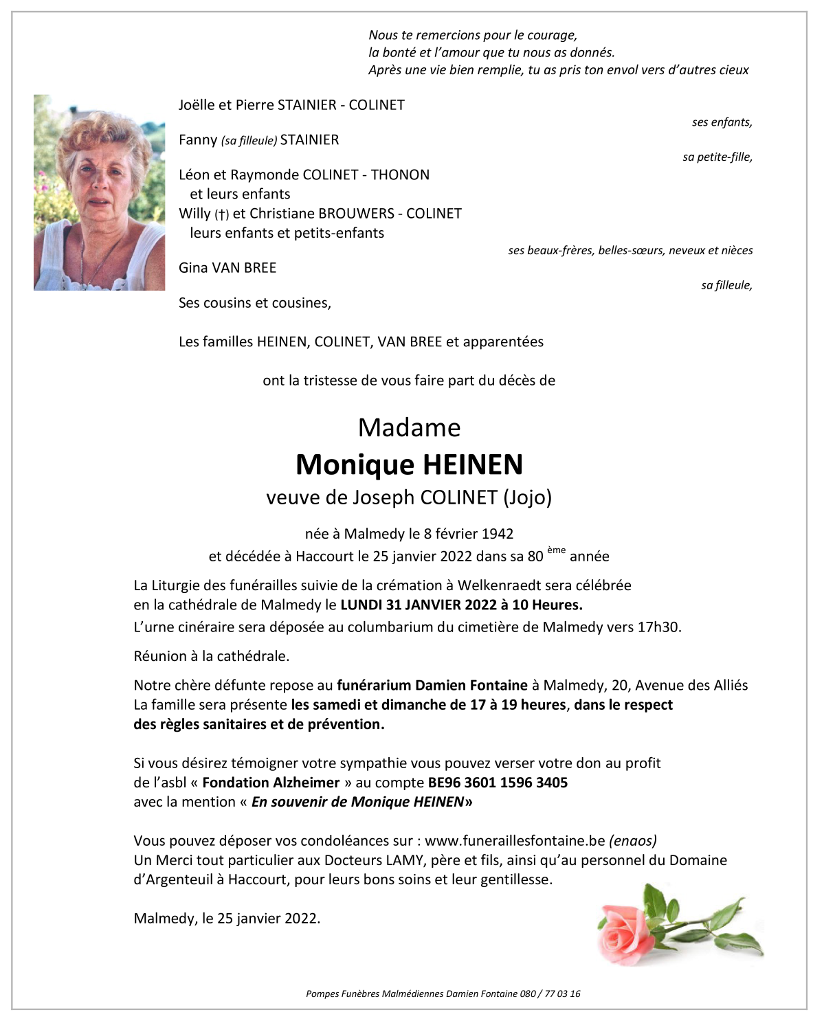 Décédée à Haccourt (4684) le mardi 25 janvier 2022 à l'âge de 79 ans