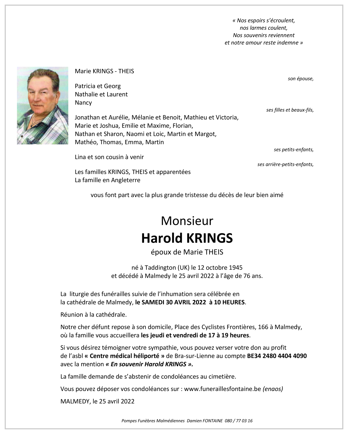 Décédé à Malmedy (4960) le lundi 25 avril 2022 à l'âge de 76 ans