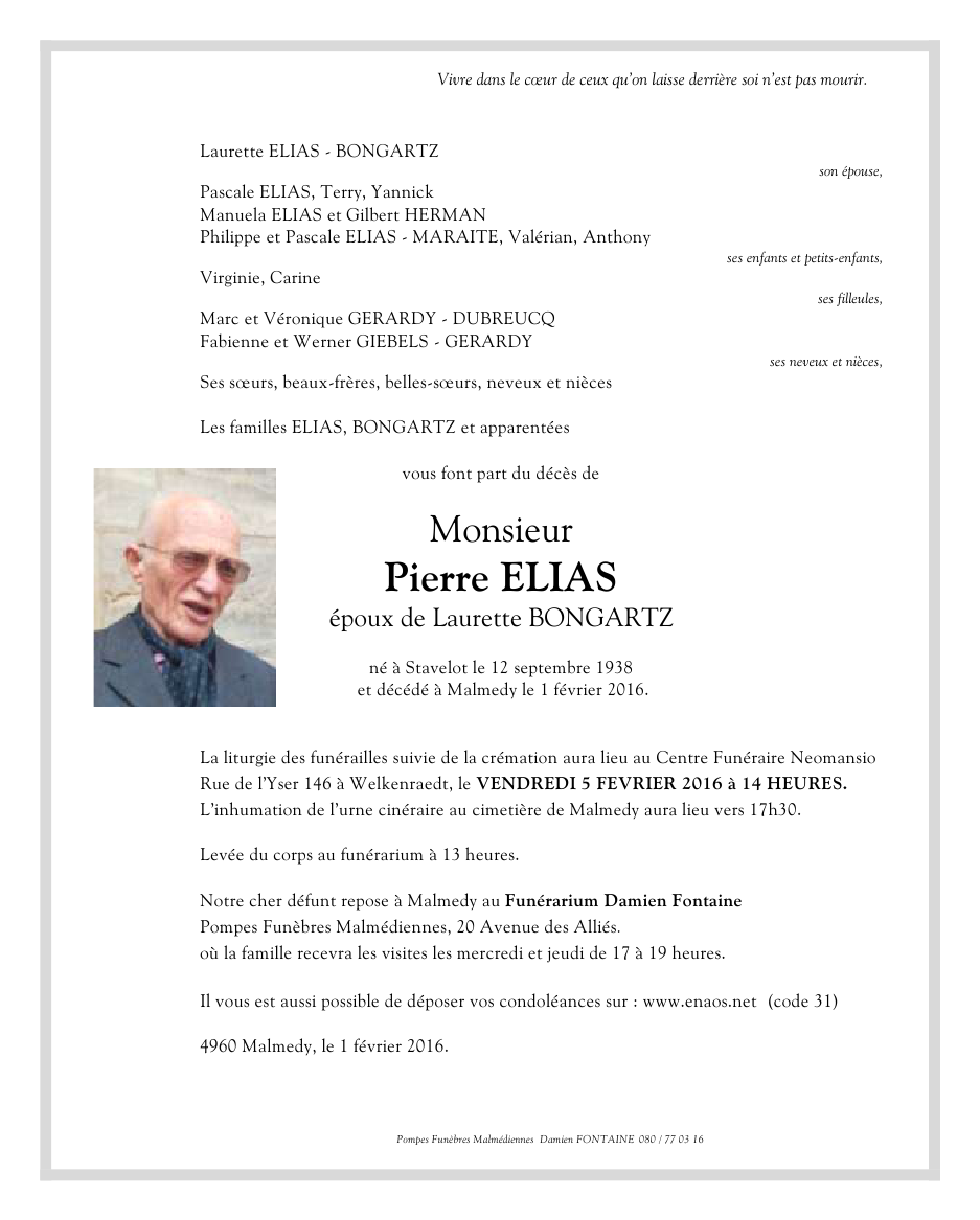 Décédé à Malmedy (4960) le lundi 1 février 2016 à l'âge de 77 ans