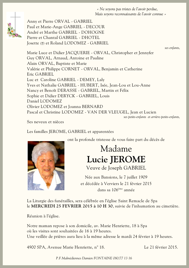 Madame Lucie JEROME veuve de Joseph GABRIEL
