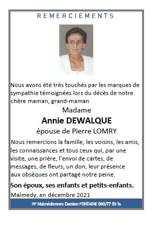 Madame Annie DEWALQUE épouse de Pierre LOMRY