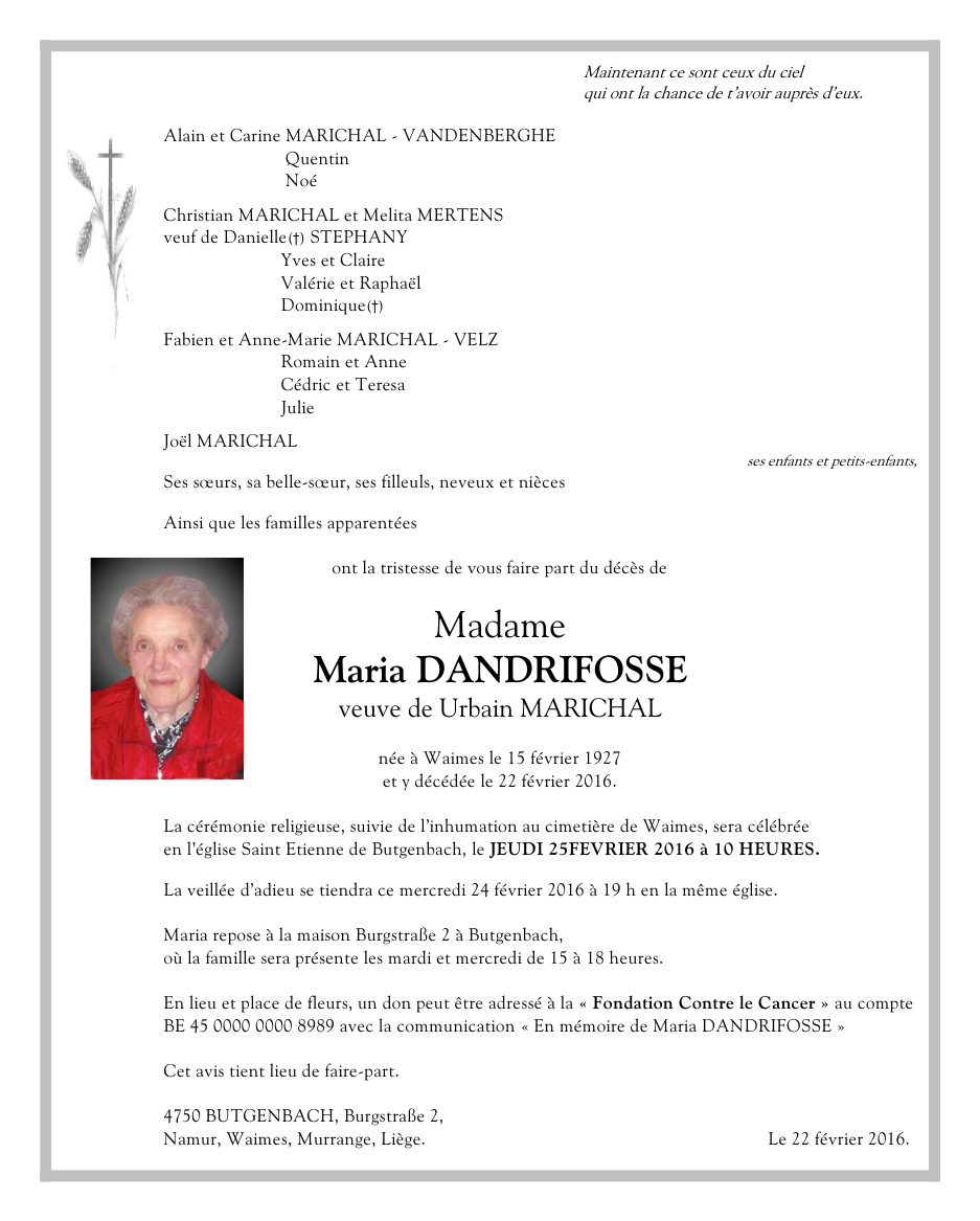 Décédée à Waimes (4700) le lundi 22 février 2016 à l'âge de 89 ans