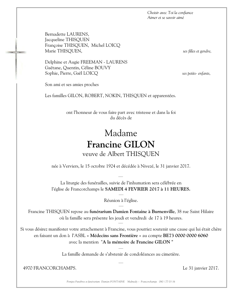 Décédée à Nivezé (4900) le mardi 31 janvier 2017 à l'âge de 92 ans