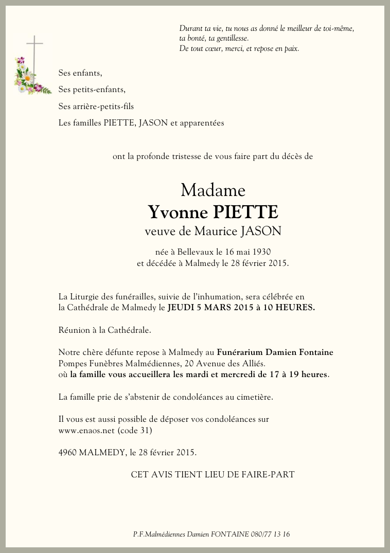 Madame Yvonne PIETTE veuve de Maurice JASON