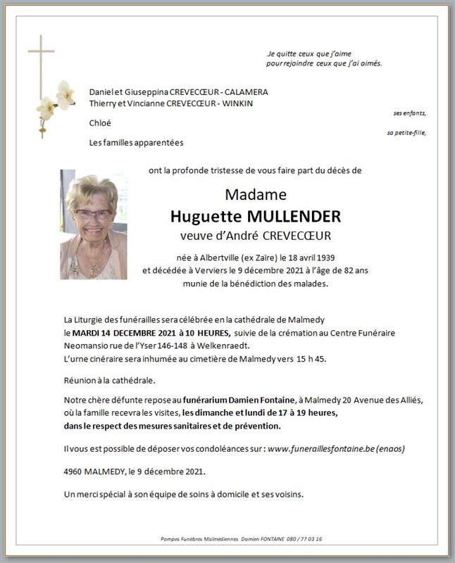 Madame Huguette CRÈVECŒUR née MULLENDER