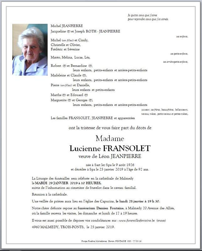Madame Lucienne FRANSOLET veuve de Léon JEANPIERRE