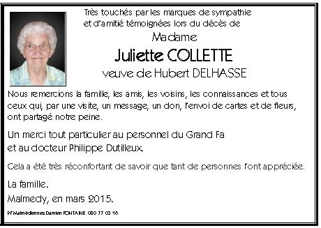Madame Juliette COLLETTE veuve de Hubert DELHASSE