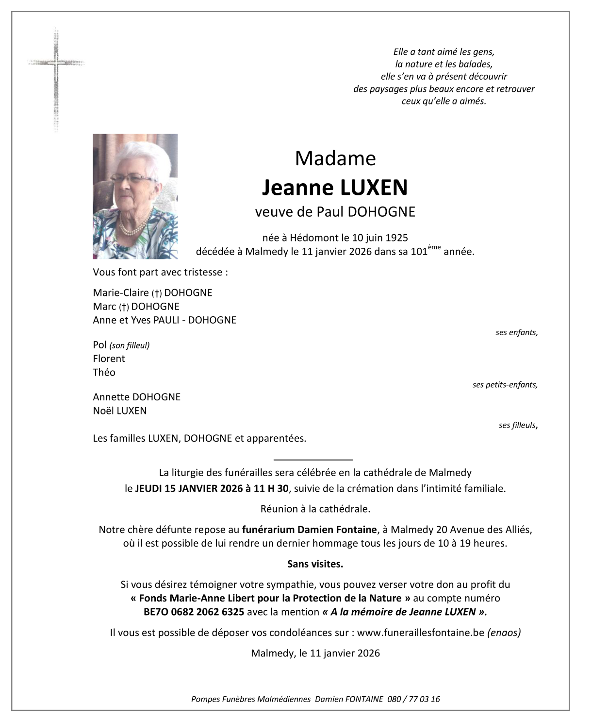 Décédée à Malmedy (4960) le dimanche 11 janvier 2026 à l'âge de 100 ans