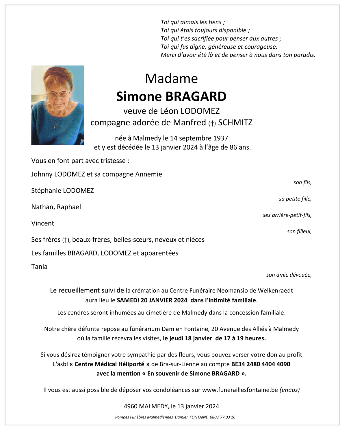Décédée à Malmedy (4960) le samedi 13 janvier 2024 à l'âge de 86 ans