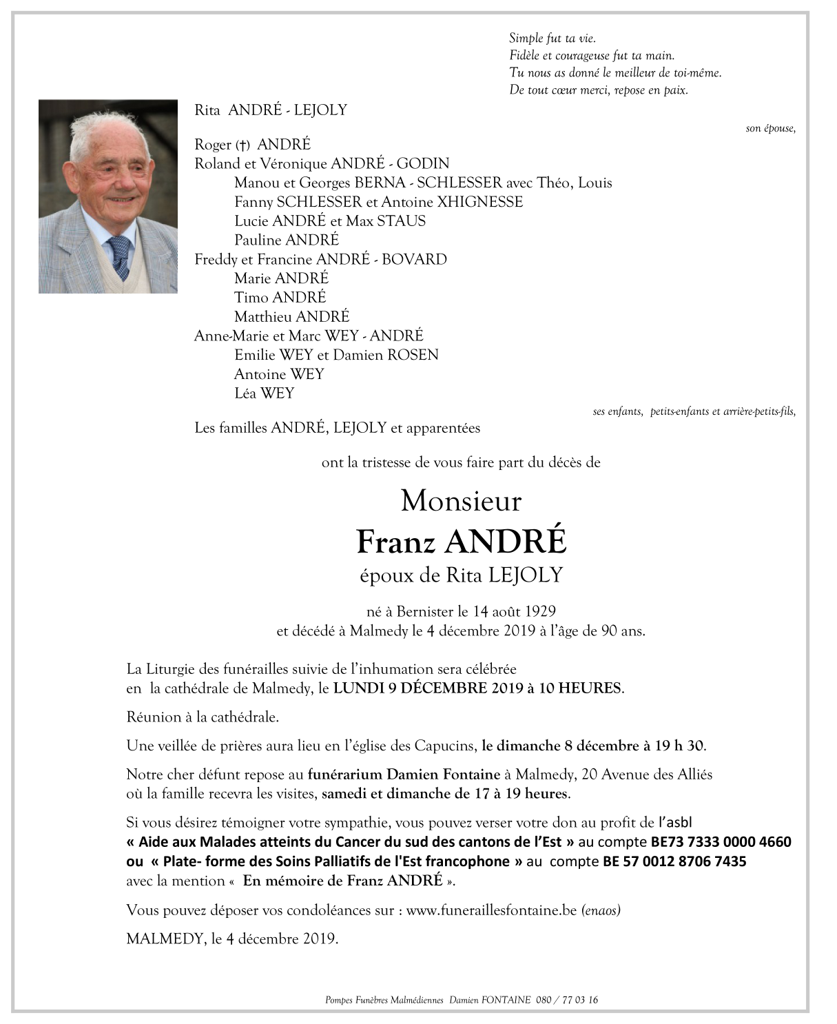 Décédé à Malmedy (4960) le mercredi 4 décembre 2019 à l'âge de 90 ans