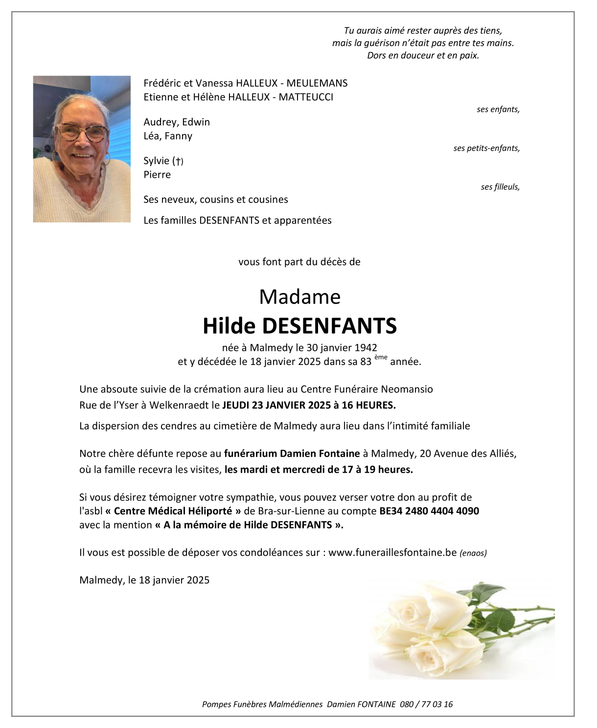 Décédée à Malmedy (4960) le samedi 18 janvier 2025 à l'âge de 82 ans
