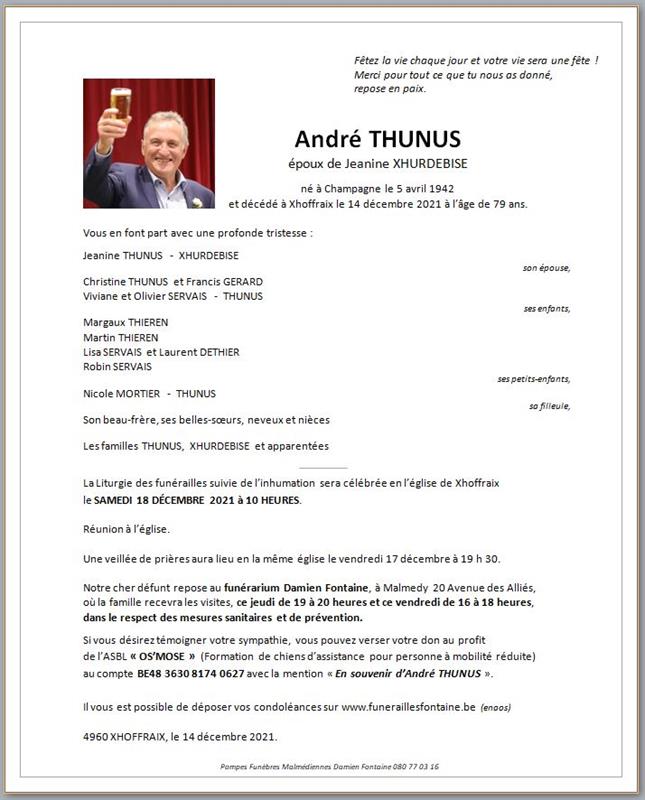 Décédé à Xhoffraix (4960) le mardi 14 décembre 2021 à l'âge de 79 ans