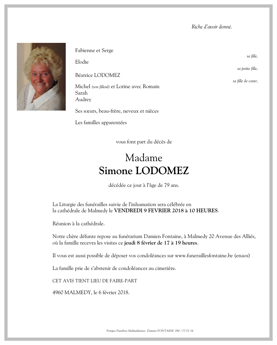 Décédée à Malmedy (4960) le mardi 6 février 2018 à l'âge de 79 ans