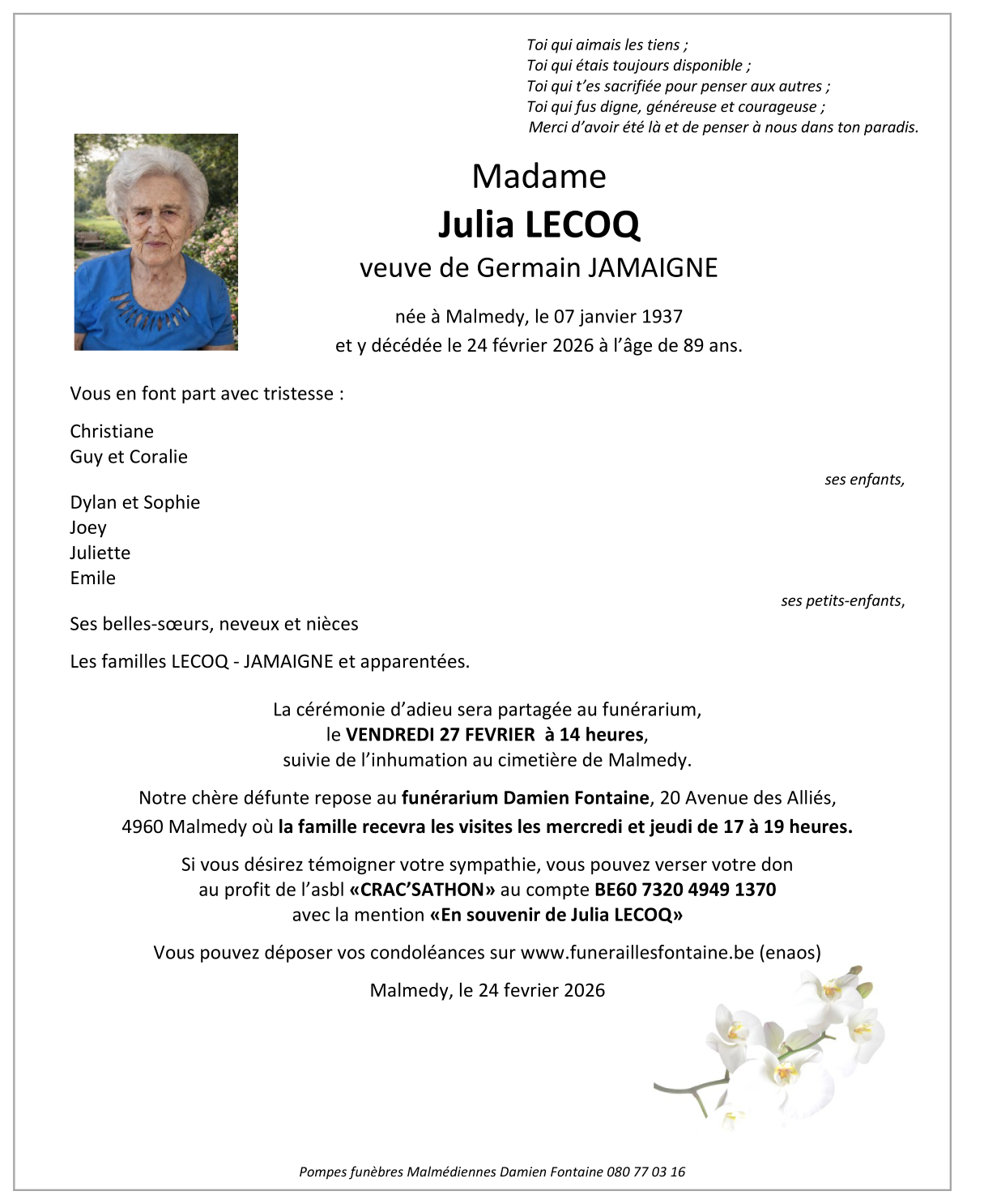 Décédée à Malmedy (4960) le mardi 24 février 2026 à l'âge de 89 ans