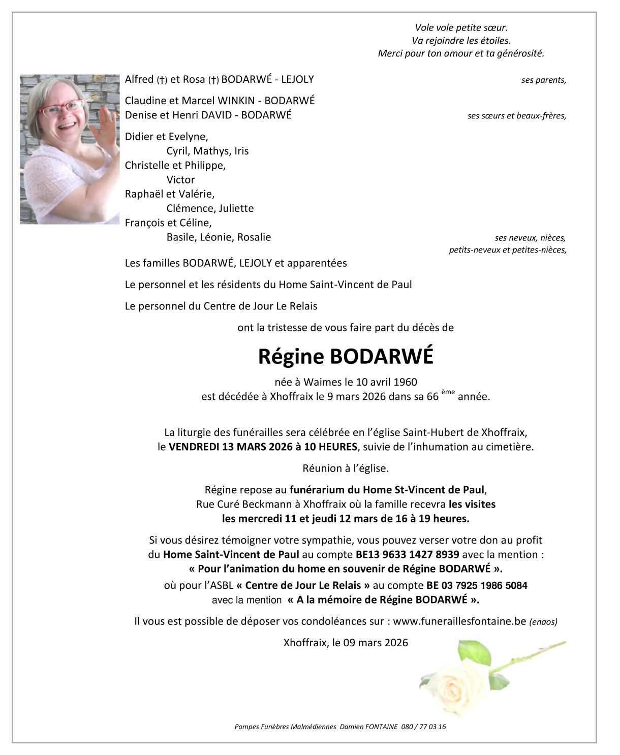Décédée à Xhoffraix (4960) le lundi 9 mars 2026 à l'âge de 65 ans