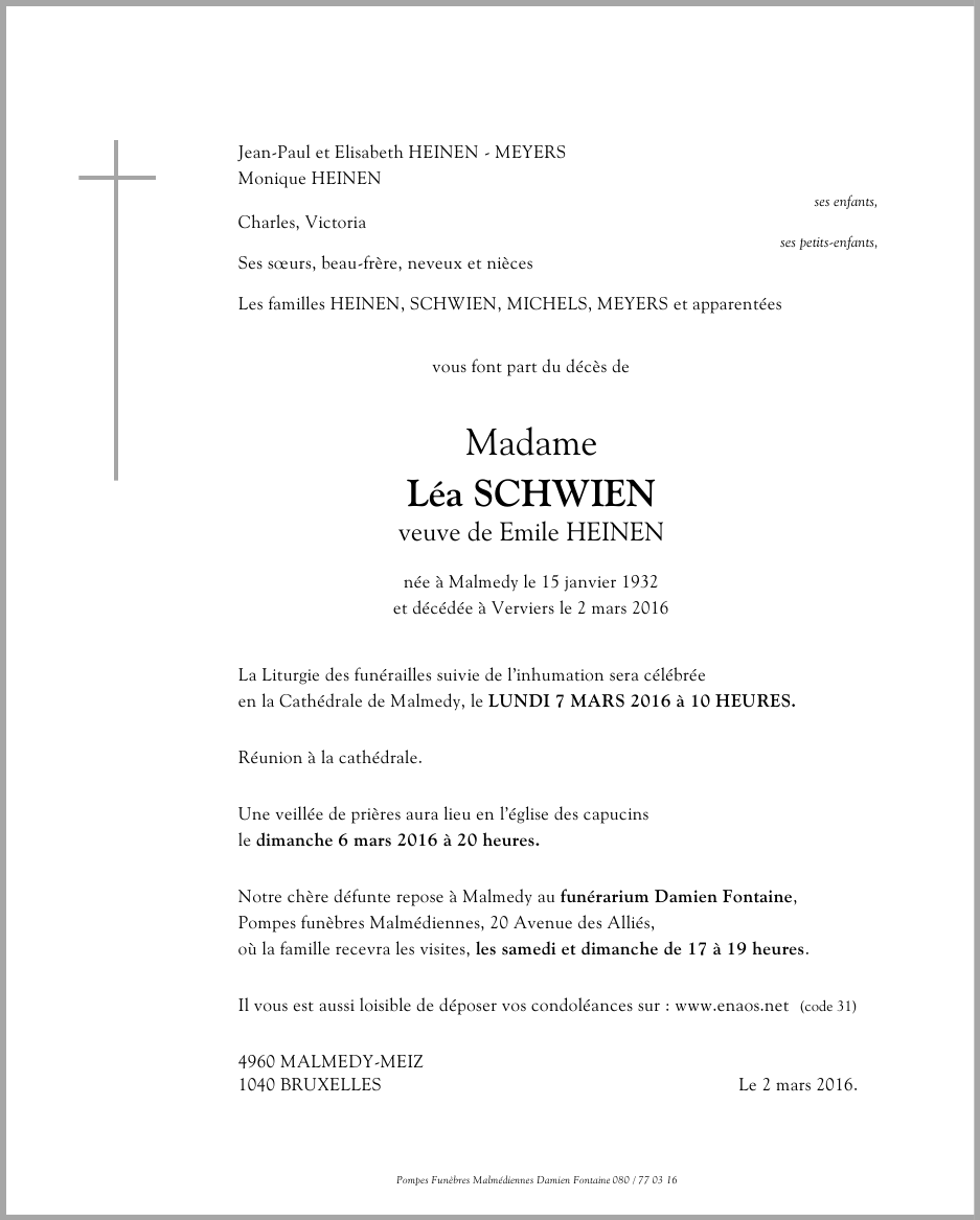 Madame Léa SCHWIEN veuve de Emile HEINEN