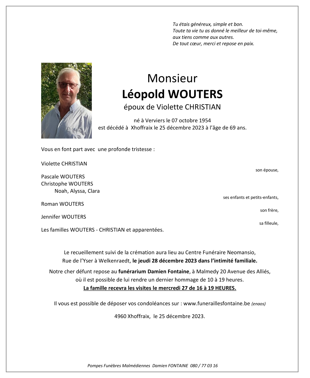 Décédé à Xhoffraix (4960) le lundi 25 décembre 2023 à l'âge de 69 ans
