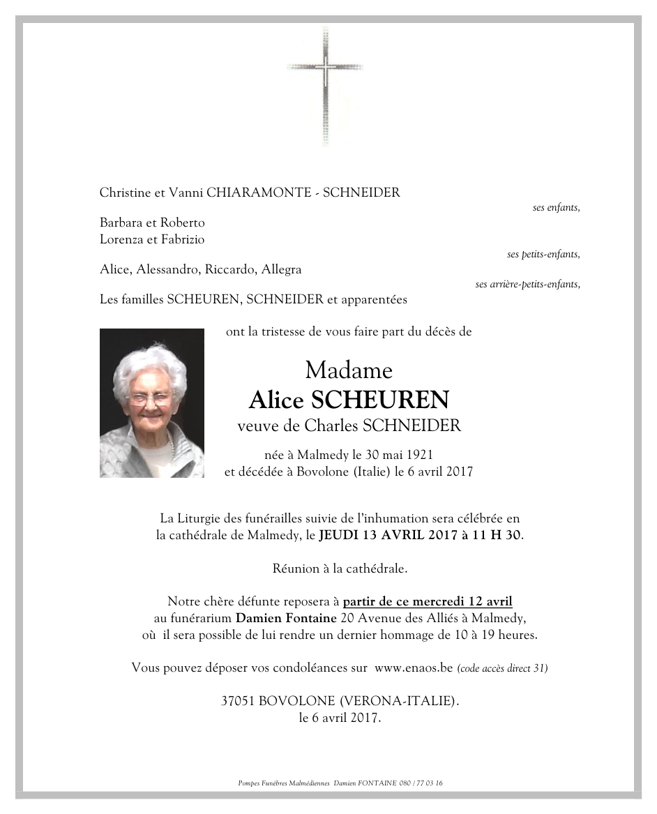 Madame Alice SCHEUREN veuve de Charles SCHNEIDER
