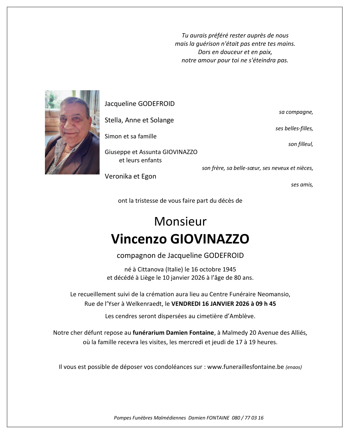 Décédé à Liège (4000) le samedi 10 janvier 2026 à l'âge de 80 ans