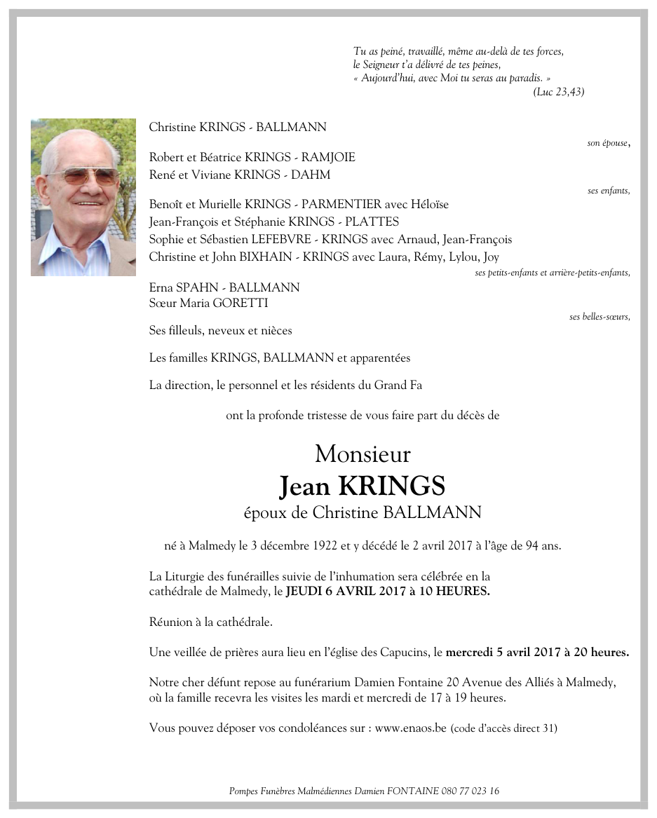 Décédé à Malmedy (4960) le dimanche 2 avril 2017 à l'âge de 94 ans