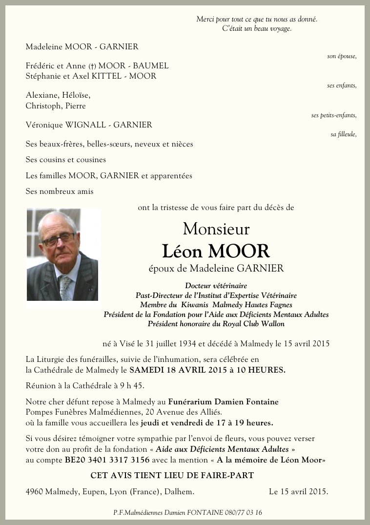 Décédé à Malmedy (4960) le mercredi 15 avril 2015 à l'âge de 80 ans