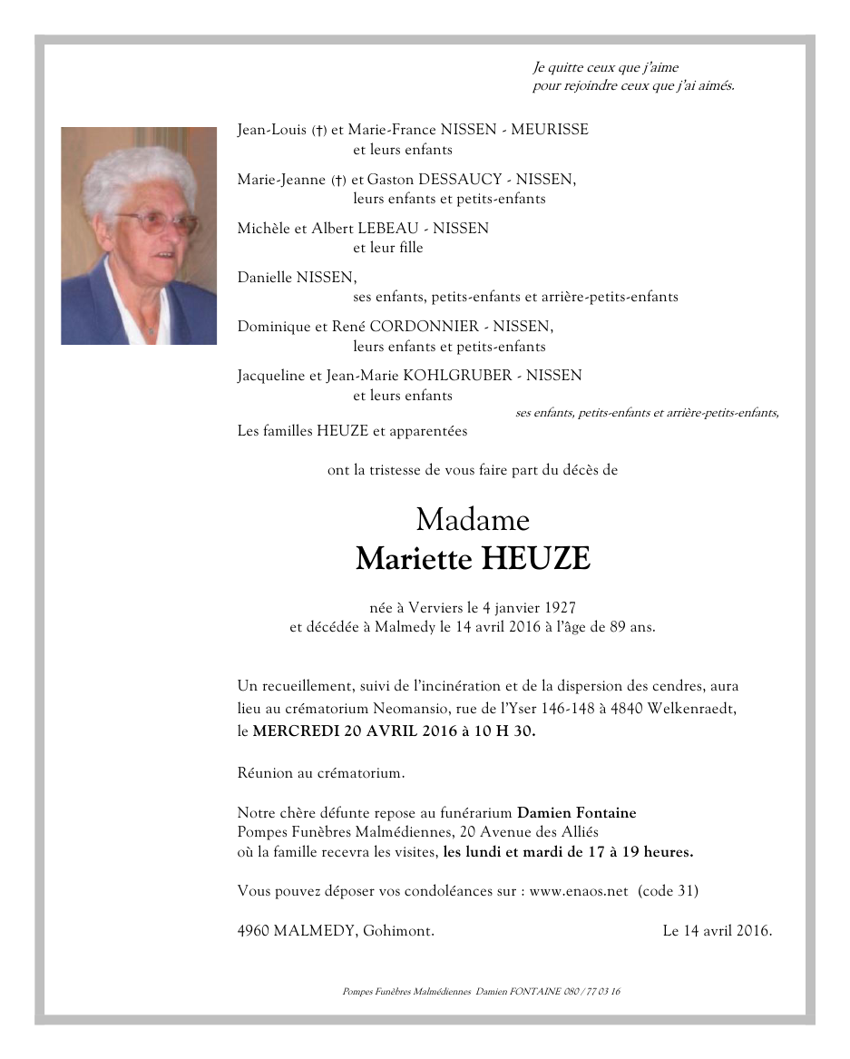 Décédée à Malmedy (4960) le jeudi 14 avril 2016 à l'âge de 89 ans