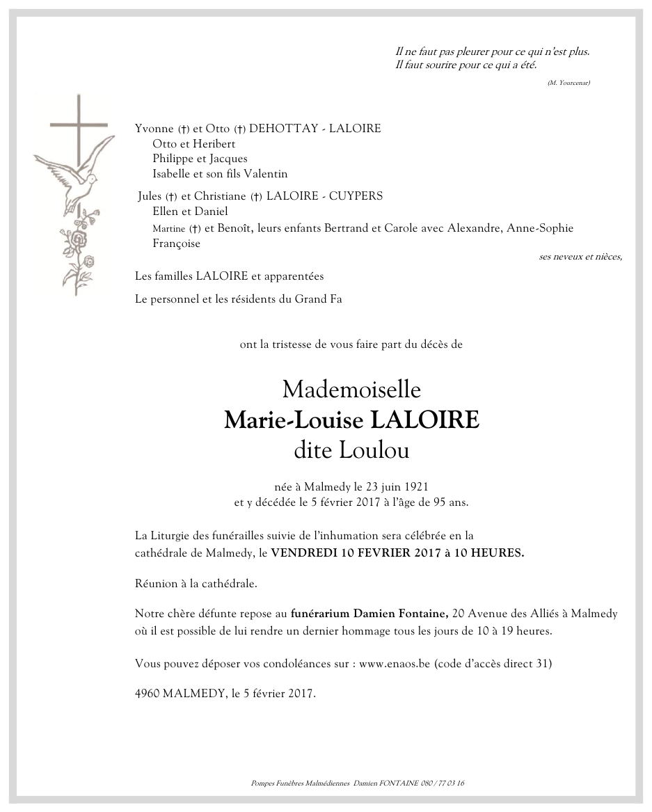 Décédée à Malmedy (4960) le dimanche 5 février 2017 à l'âge de 95 ans