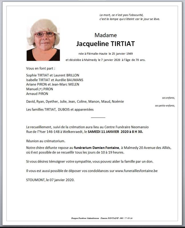 Décédée à Malmedy (4960) le mardi 7 janvier 2020 à l'âge de 70 ans
