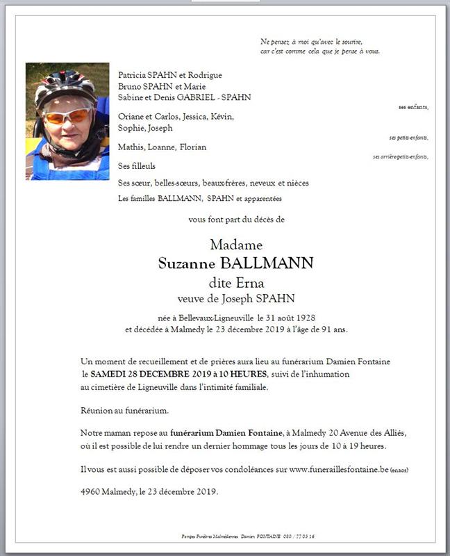 Décédée à Malmedy (4960) le lundi 23 décembre 2019 à l'âge de 91 ans