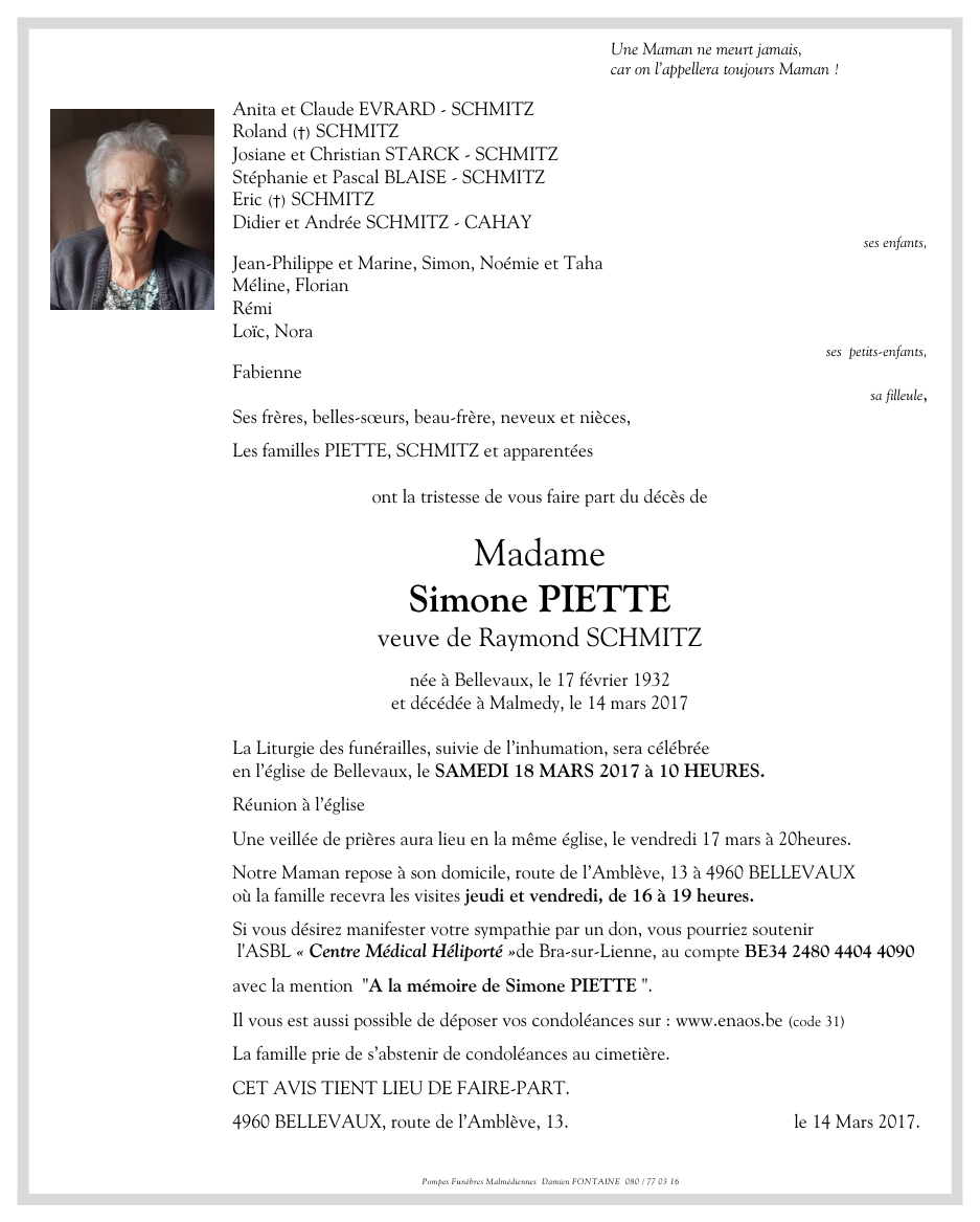 Madame Simone PIETTE veuve de Raymond SCHMITZ