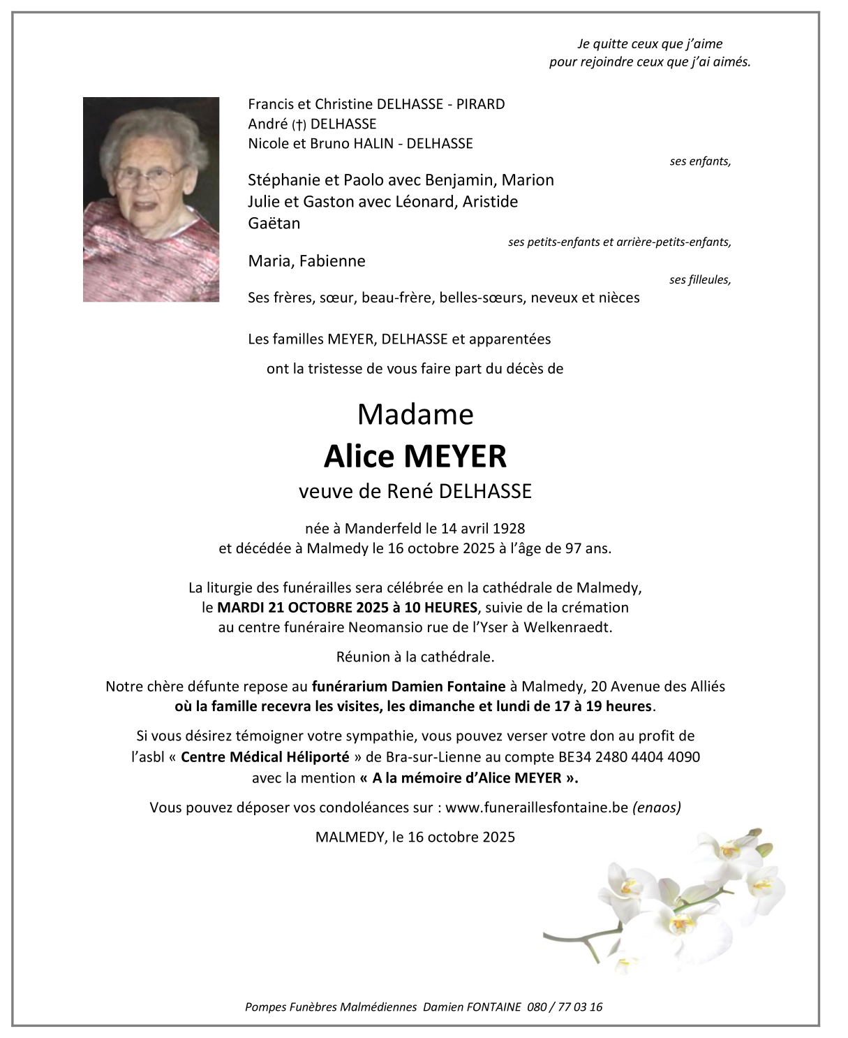 Décédée à Malmedy (4960) le jeudi 16 octobre 2025 à l'âge de 97 ans