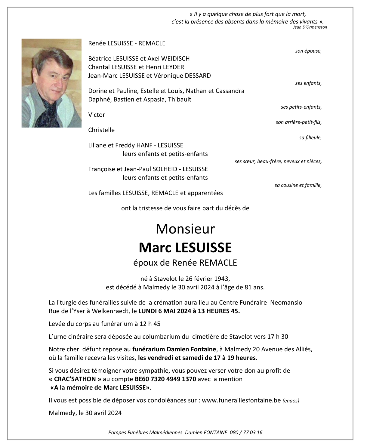 Décédé à Malmedy (4960) le mardi 30 avril 2024 à l'âge de 81 ans