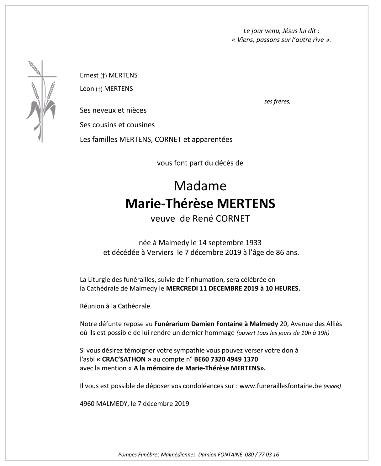 Madame Marie-Thérèse MERTENS veuve de René CORNET