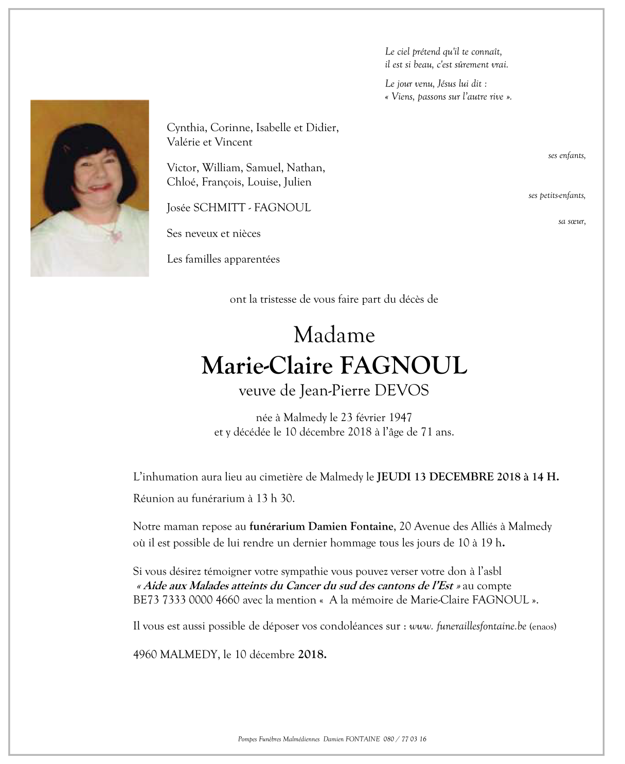 Madame Marie-Claire FAGNOUL veuve de Jean-Pierre DEVOS