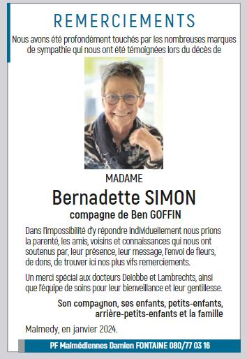 Décédée à Malmedy (4960) le samedi 6 janvier 2024 à l'âge de 71 ans