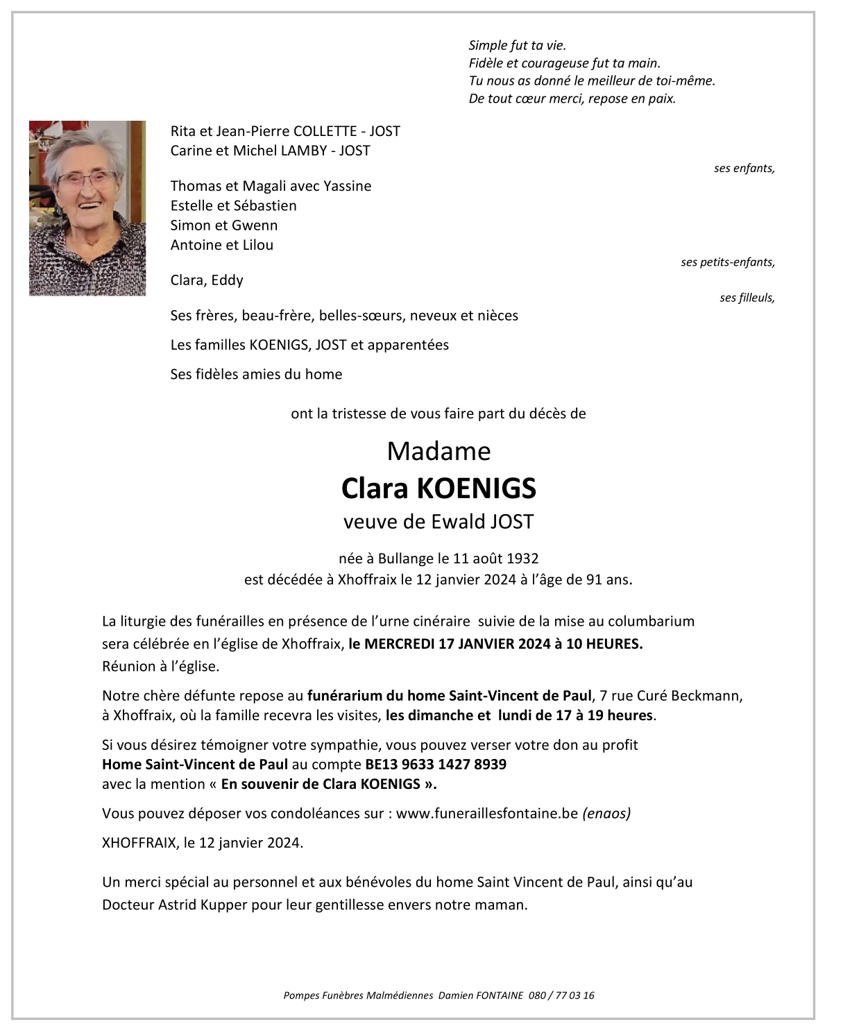Décédée à Xhoffraix (4960) le vendredi 12 janvier 2024 à l'âge de 91 ans