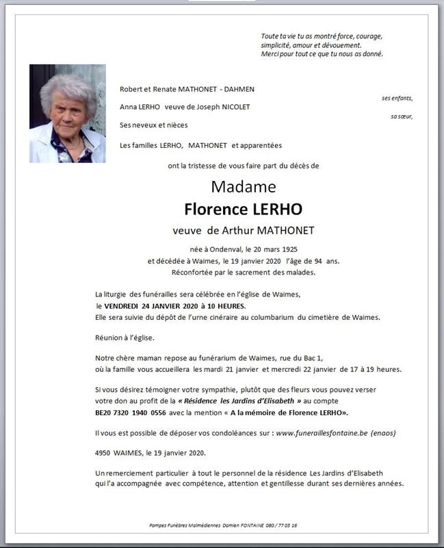 Madame Florence LERHO veuve de Arthur MATHONET