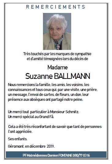 Décédée à Malmedy (4960) le lundi 23 décembre 2019 à l'âge de 91 ans
